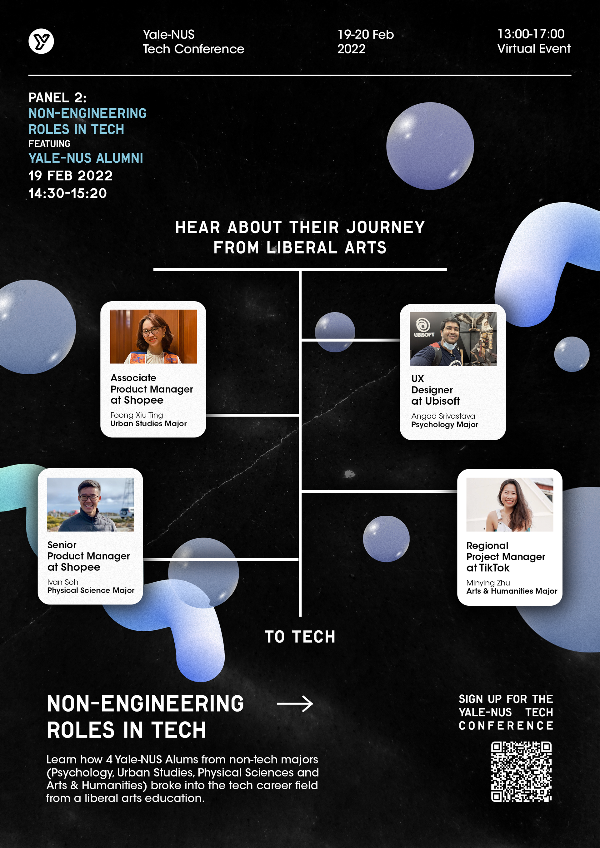 A first of its kind, the Yale-NUS Tech Conference is a flagship event that illuminates various creative and innovative careers in tech for students of all major backgrounds. As the lead for design and branding for the conference, I created marketing collaterals that align with our experimental and transformative vision. My challenge was to cohesively contain two antithetical characteristics in one medium – plenty of textual information and visual salience.